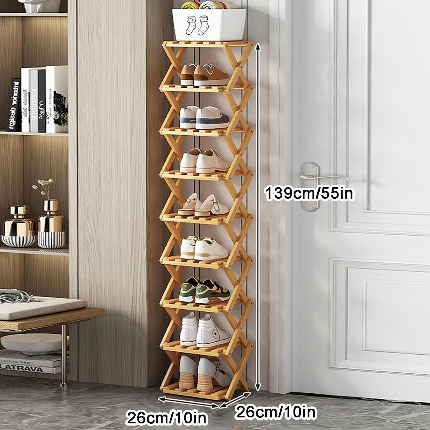 Grâce à ses plusieurs niveaux, elle peut accueillir plusieurs paires de chaussures tout en les maintenant bien aérées. Son style minimaliste et chaleureux s’harmonise avec tous les types de décoration intérieure.